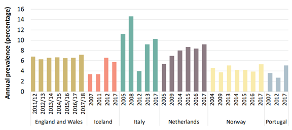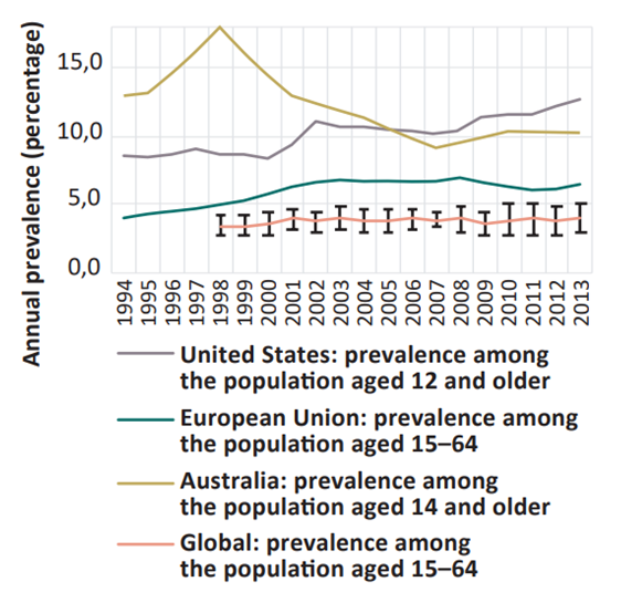 While the United States and Canada have seen a significant increase in cannabis use, Oceania shows different trends. Annual cannabis use in Oceania was substantially higher than in the USA in the 1990s, but has decreased dramatically in recent years. Cannabis use in Western and Central Europe is estimated to be prevalent in 6-7 percent of the population aged 15-64. The highest usage of cannabis has been reported by France, Italy, Czechia, Netherlands, Switzerland, and Spain.