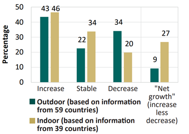 Between 2013 and 2017, 80 nations reported outdoor cultivation of cannabis, while 55 countries reported indoor cannabis cultivation. Most of the countries that report indoor cultivation are located in Europe, followed by Canada and the USA, Central America, and South America. In other areas indoor cannabis cultivation is still limited, with Australia, New Zealand, Georgia, Israel, Hong Kong, China, and Armenia, reporting some indoor cultivation.