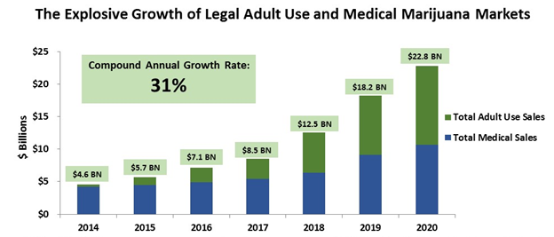 In same study, it was estimated that medical marijuana, which emerged as the largest marijuana-related sector in 2016, would be valued at $100.03 billion by 2025.